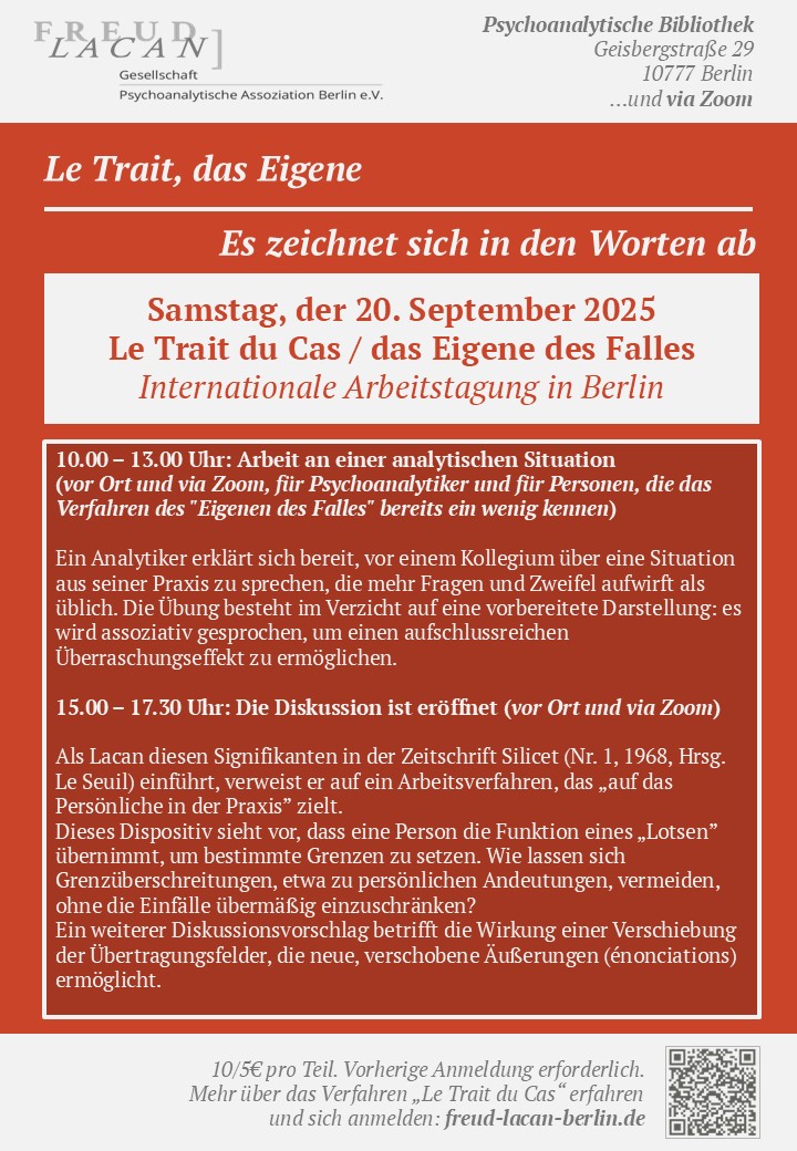 Der Nachmittags-Teil ist öffentlich (als Hybridveranstaltung incl. ZOOM). Voranmeldung ist erforderlich (s.u.). In Kurzvorträgen und Gesprächen versuchen wir u.a. herauszuarbeiten, worin sich die Methode des “trait du cas” von einer “Intervision” unterscheidet und wie die drei verschiedenen Instanzen des „trait du cas“ miteinander verknüpft sind, nämlich klinische Erfahrung, Theoretisierung und zu veröffentlichender Text.
